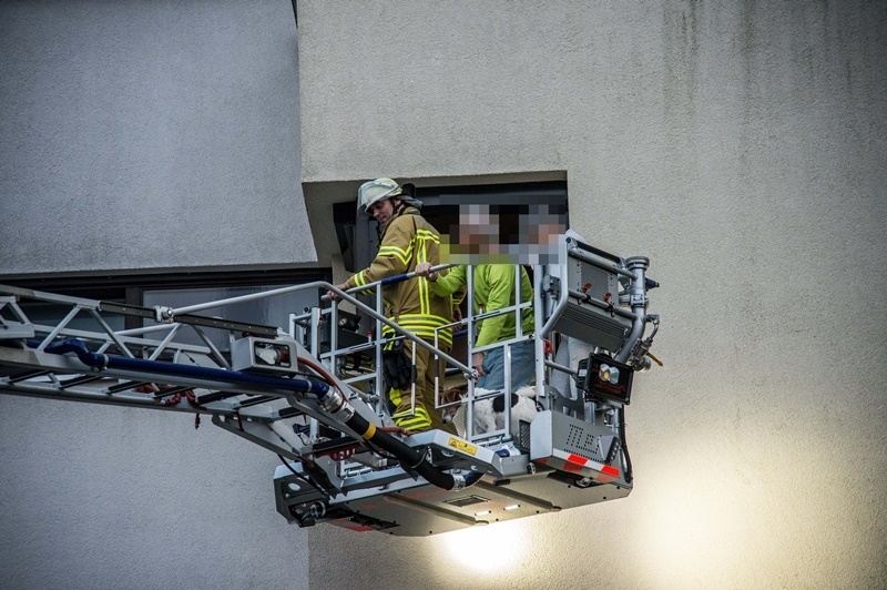 Beim Eintreffen der ersten Kräfte drang dichter Rauch aus dem Keller und dem Treppenraum, womit der erste Rettungsweg für die Bewohner versperrt war. Der Rauch begann sich in die Wohnungen auszubreiten. Es wurden 6 Personen und ein Hund über die Drehleiter gerettet sowie 2 Personen über die Balkone auf der Rückseite in Sicherheit gebracht, die anschließend dem Rettungsdienst zur Erstversorgung übergeben wurden.