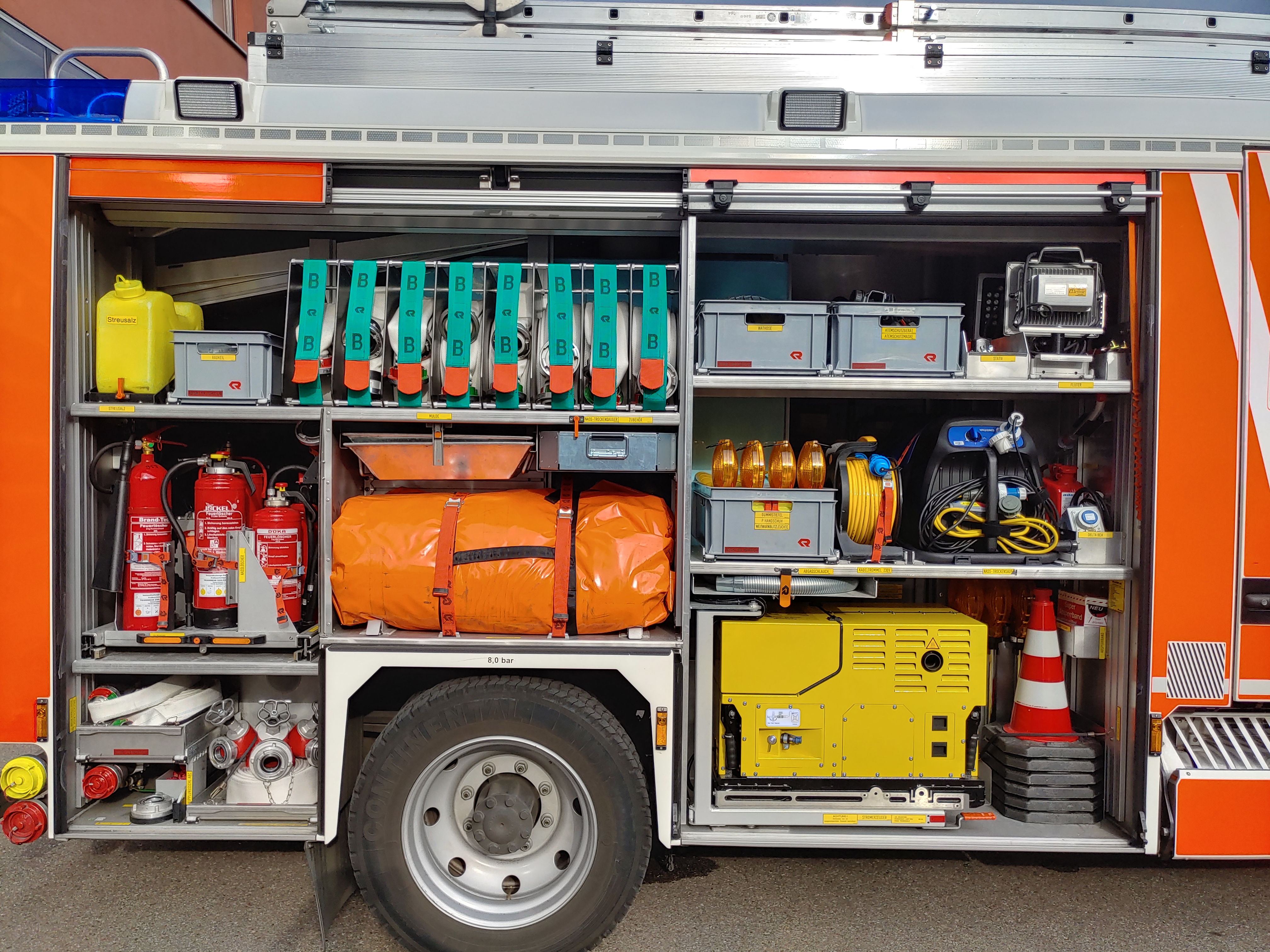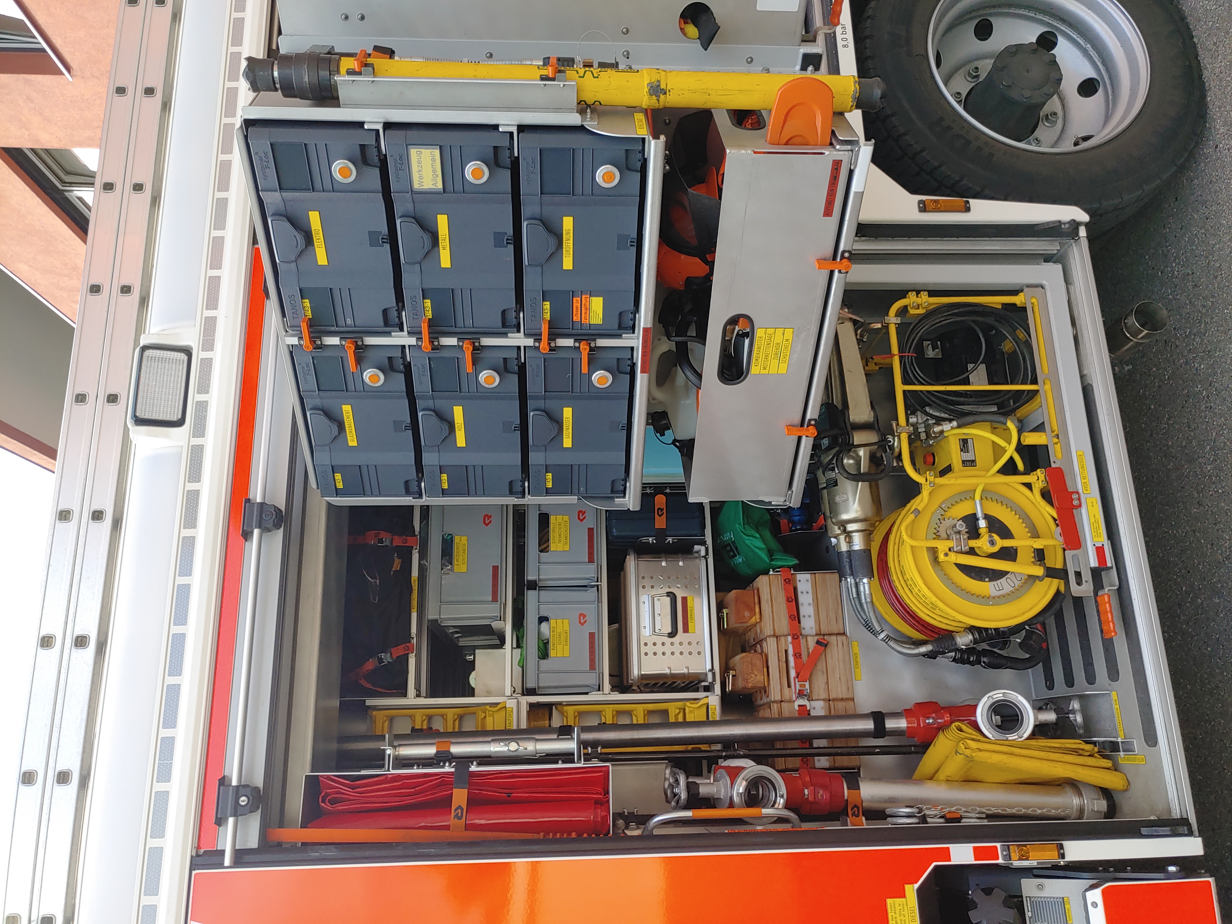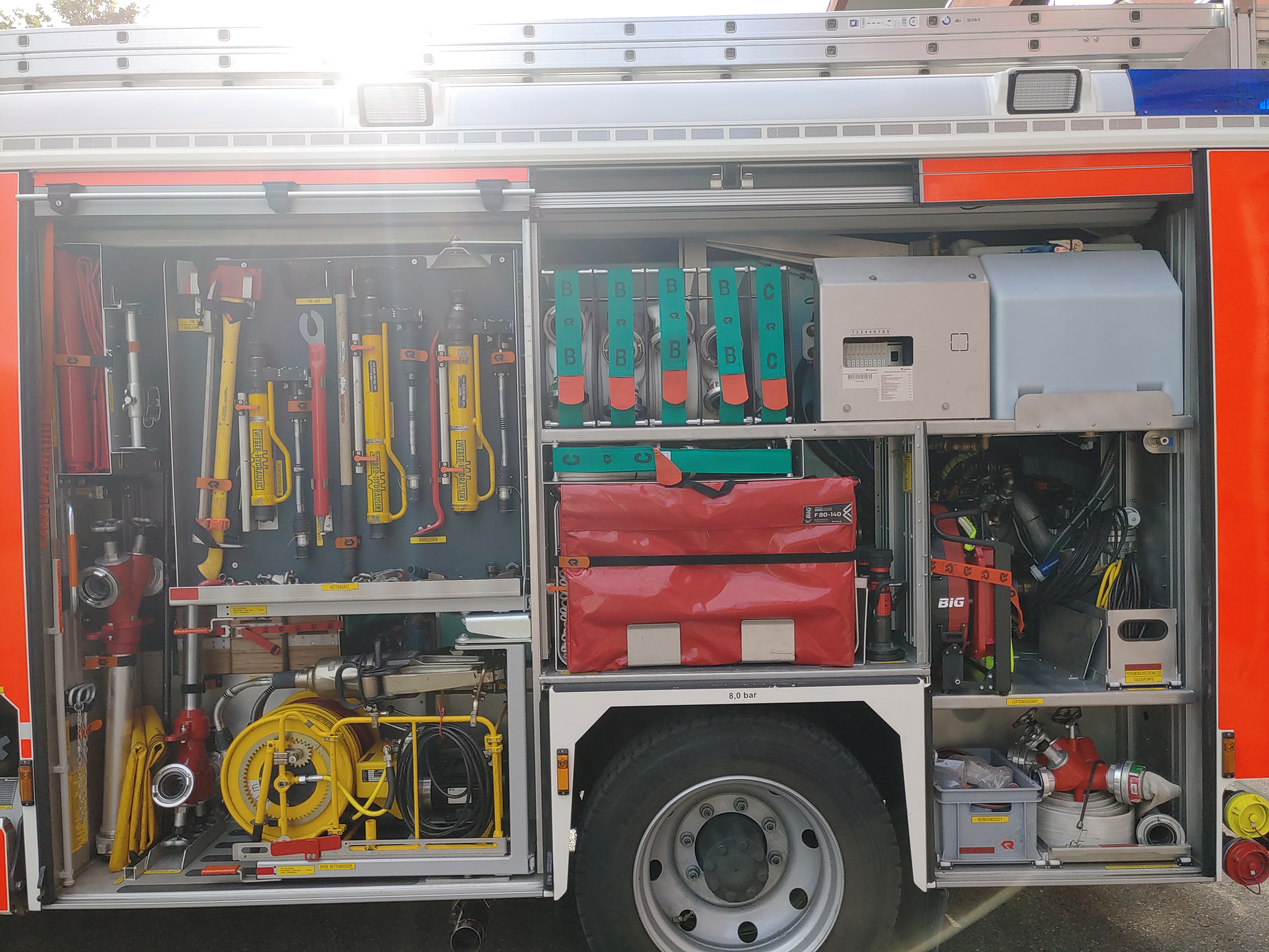 Class-A-Schaumanlage, First-Responder-Ausstattung, Hydraulischer Rettungssatz, Türöffnungswerkzeug klein, doppelte Funkanlage (analog / digital) Weitere Ausrüstung: 1600 Liter Wassertank Wärmebildkamera Gas-Warngerät Schlauchpaket Hydr. Rettungsgerät (Schere, Spreizer, Teleskop-Zylinder) Säbelsäge Roll Gliss Notfallrucksack groß Verbandsmaterialkoffer Schlauchtragekörbe C Hohlstrahlrohre Atemschutzüberwachung Glas-Management-Koffer Schleuderketten |
