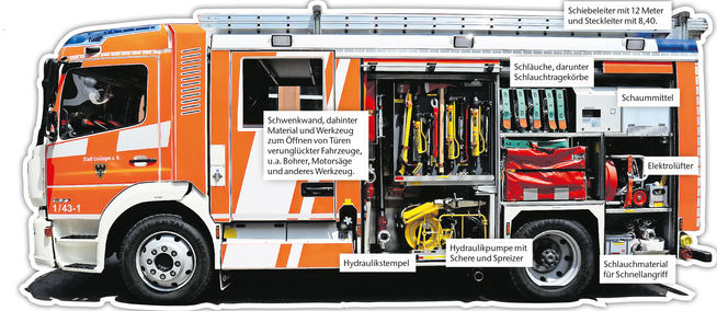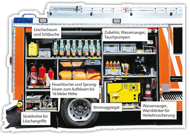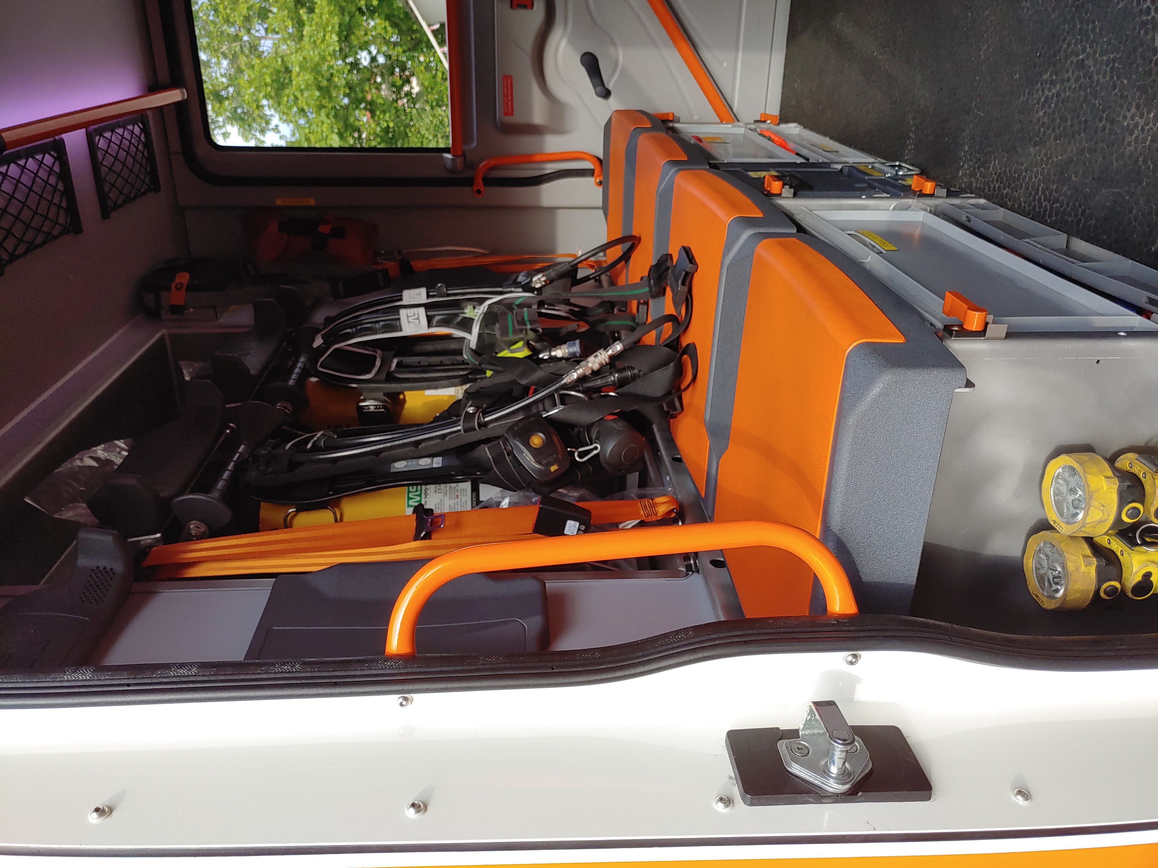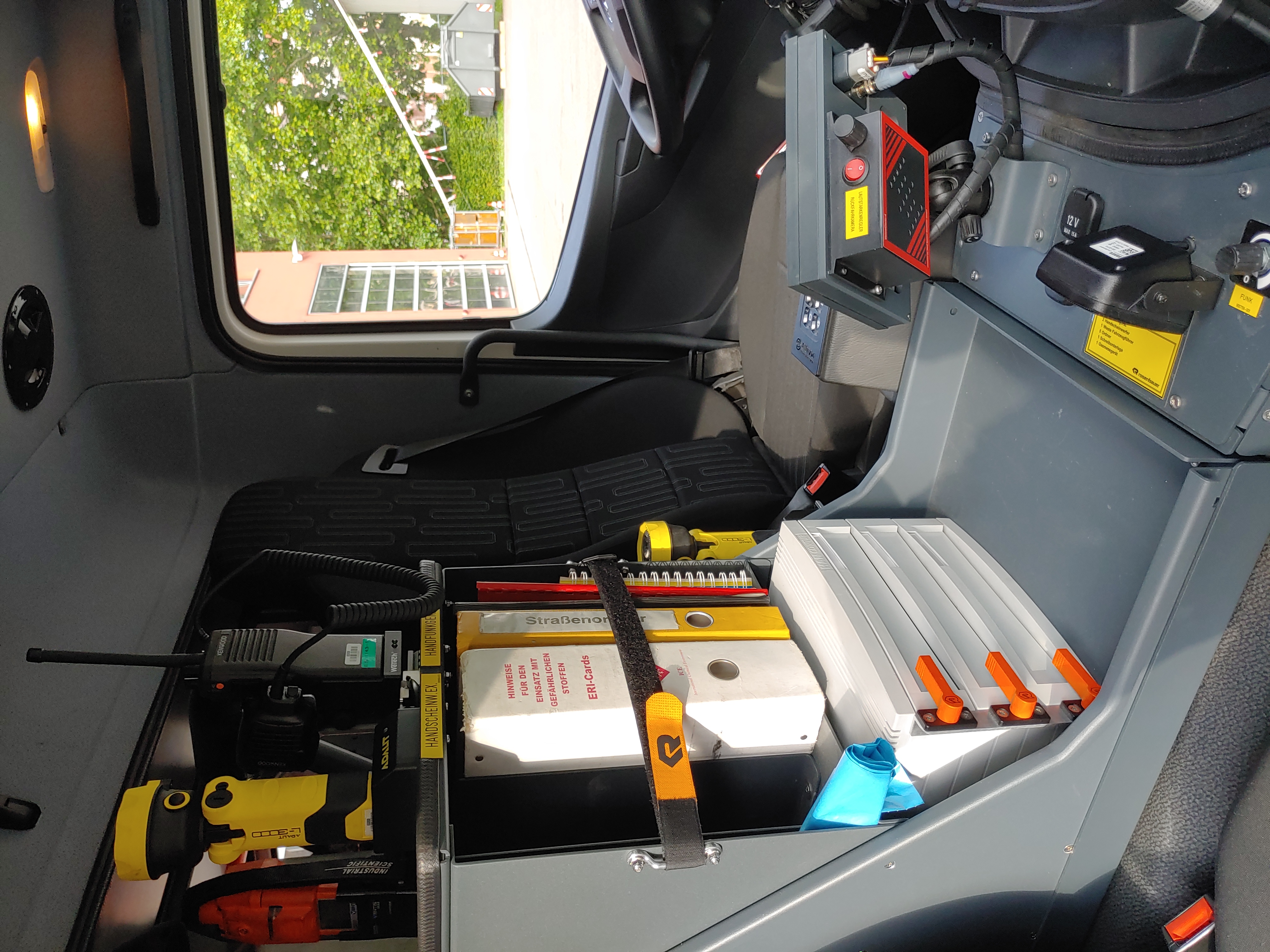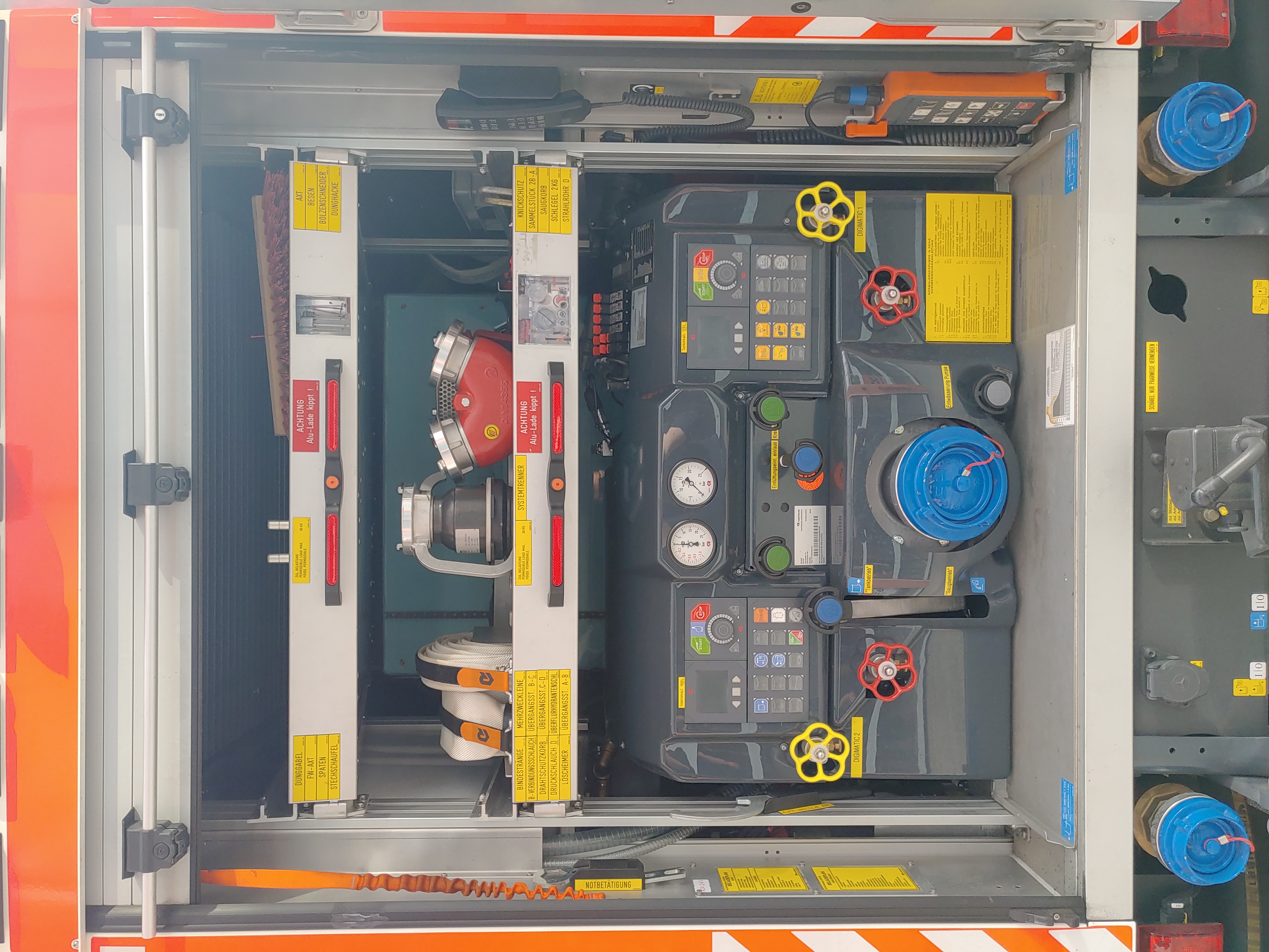 Class-A-Schaumanlage, First-Responder-Ausstattung, Hydraulischer Rettungssatz, Türöffnungswerkzeug klein, doppelte Funkanlage (analog / digital) Weitere Ausrüstung: 1600 Liter Wassertank Wärmebildkamera Gas-Warngerät Schlauchpaket Hydr. Rettungsgerät (Schere, Spreizer, Teleskop-Zylinder) Säbelsäge Roll Gliss Notfallrucksack groß Verbandsmaterialkoffer Schlauchtragekörbe C Hohlstrahlrohre Atemschutzüberwachung Glas-Management-Koffer Schleuderketten |