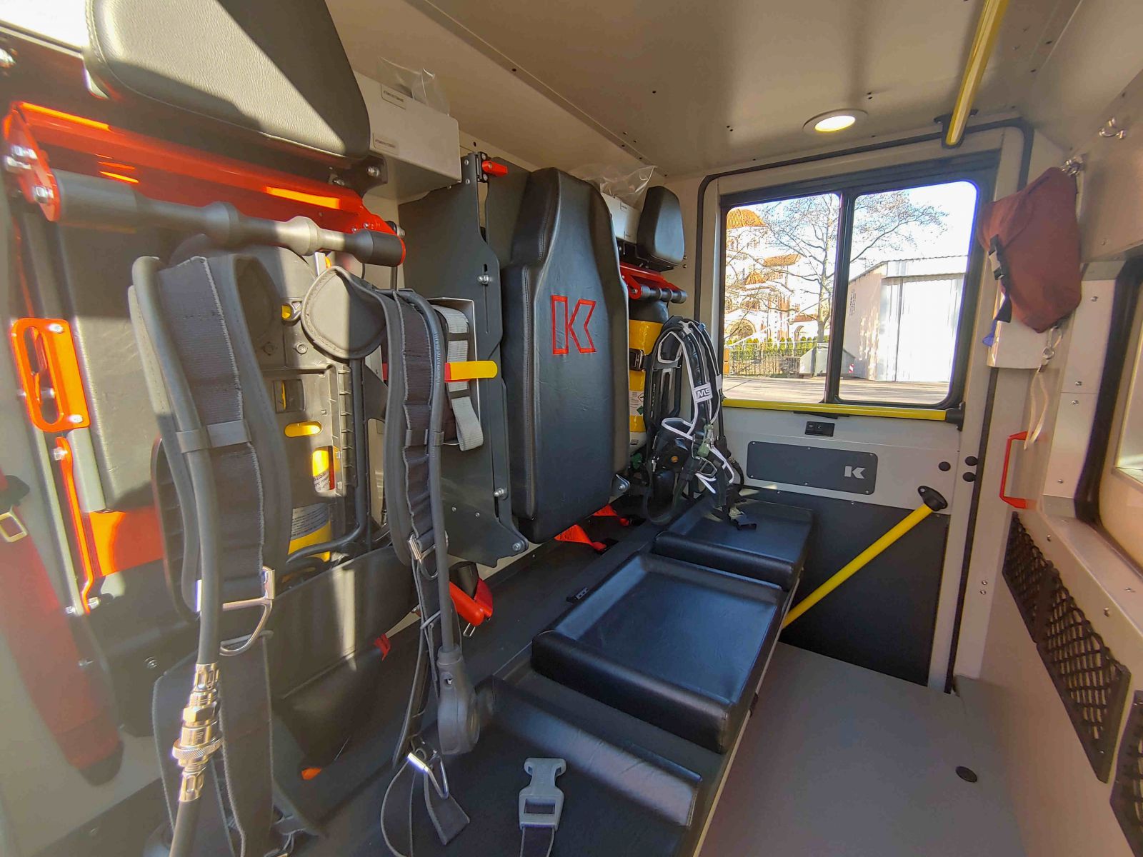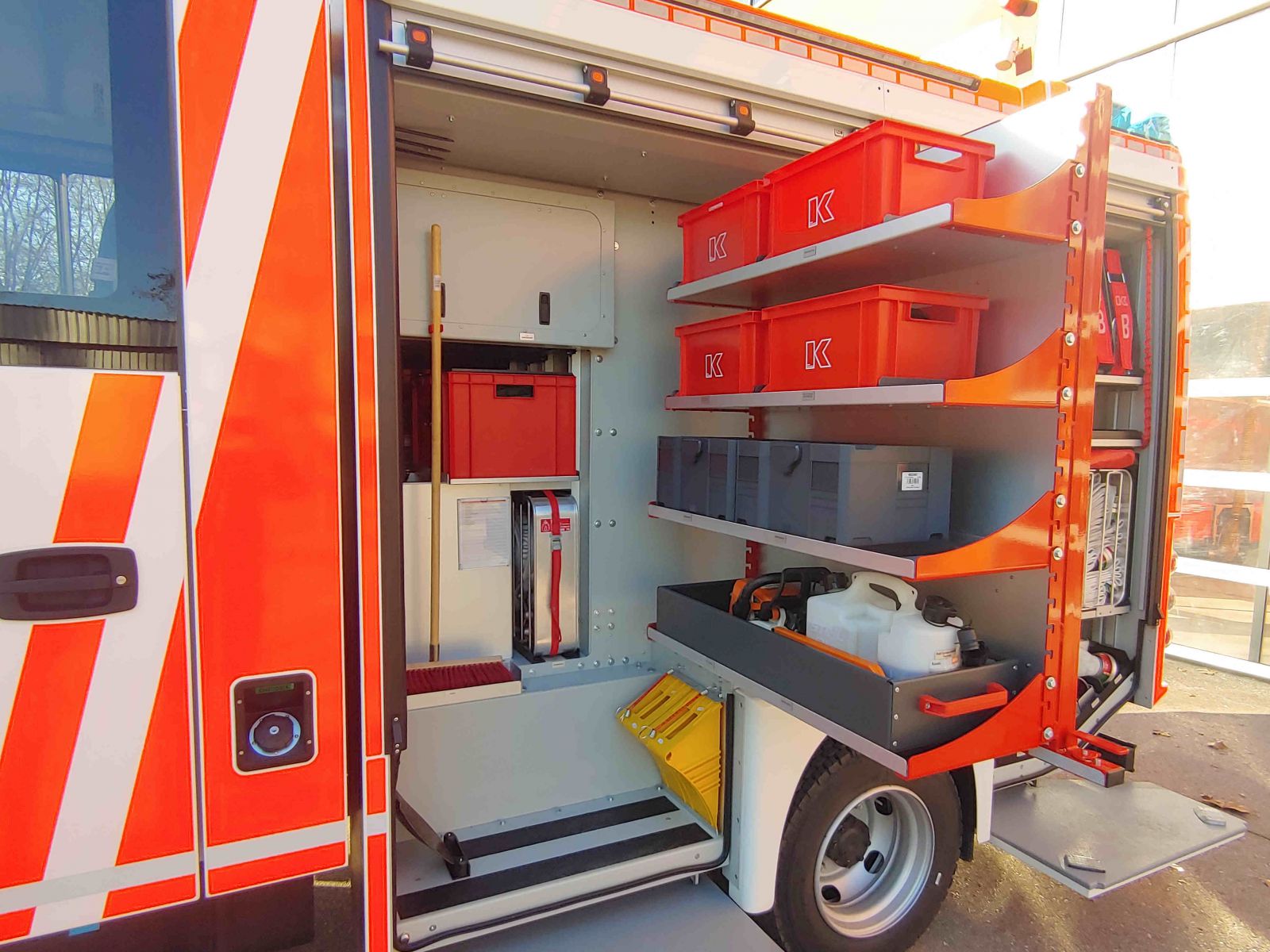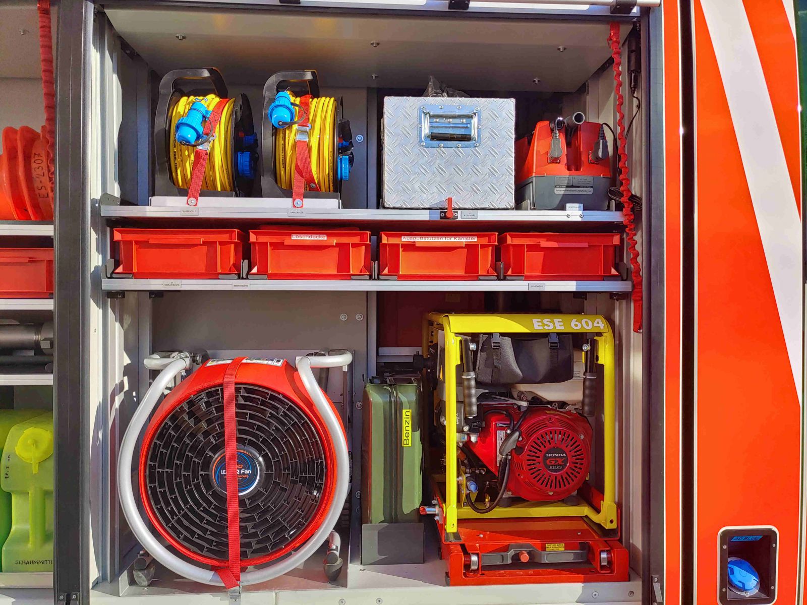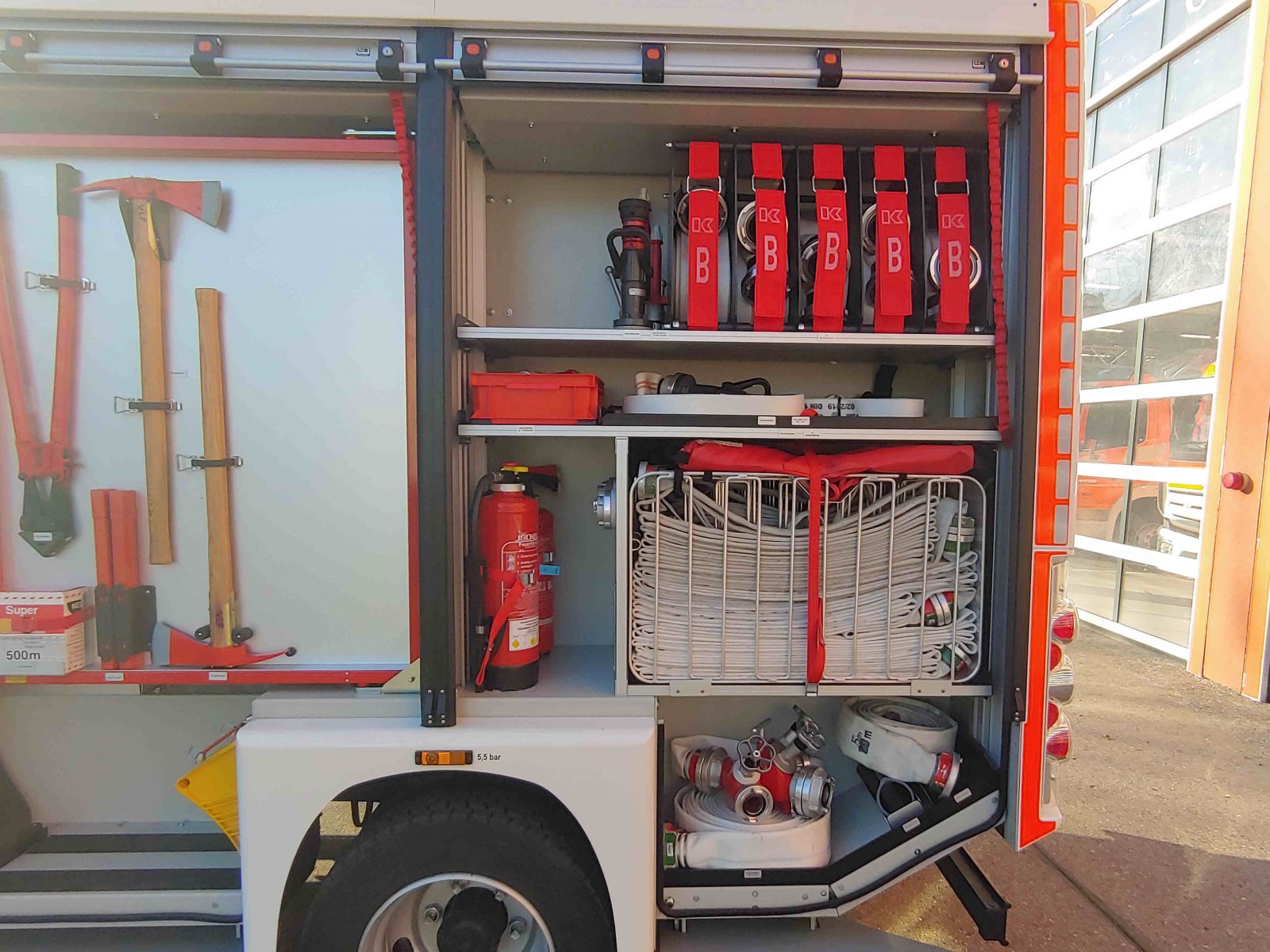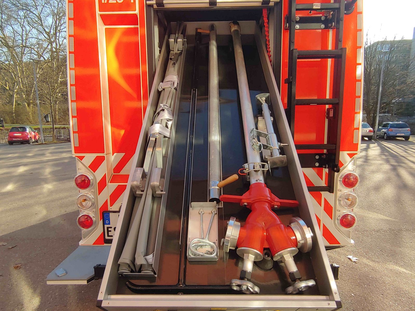 Beladung nach DIN 14530-25 (MLF) u.a.: - 1000l Löschwasserbehälter - Im GR verbaute PFPN (Hale PowerFlow GP17/10) - Wärmebildkamera FLIR K2 - 4x Pressluftatmer - elektrischer betriebener Lüfter (Leader) - Akku-Beleuchtungsgerät |
