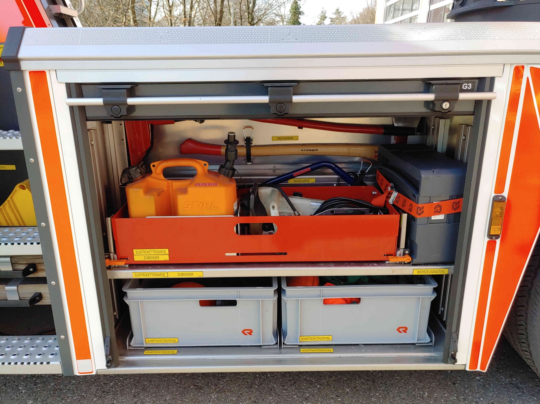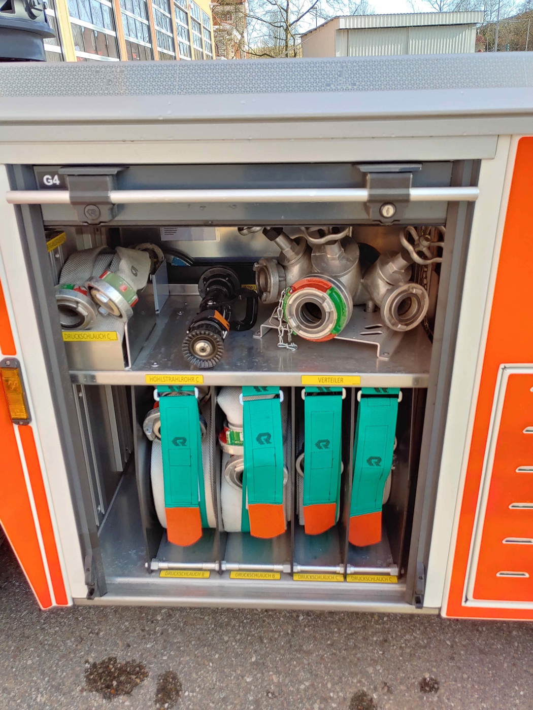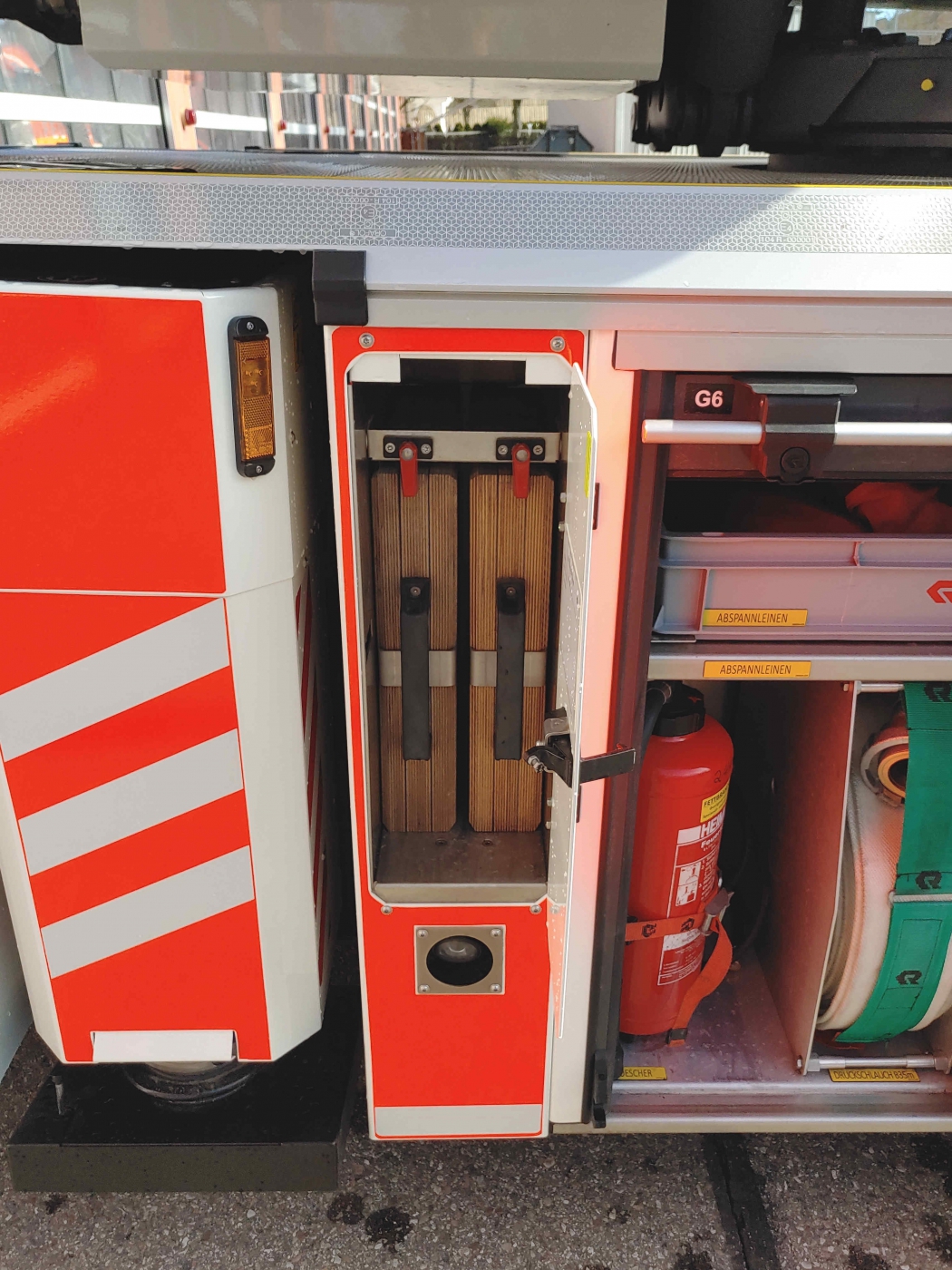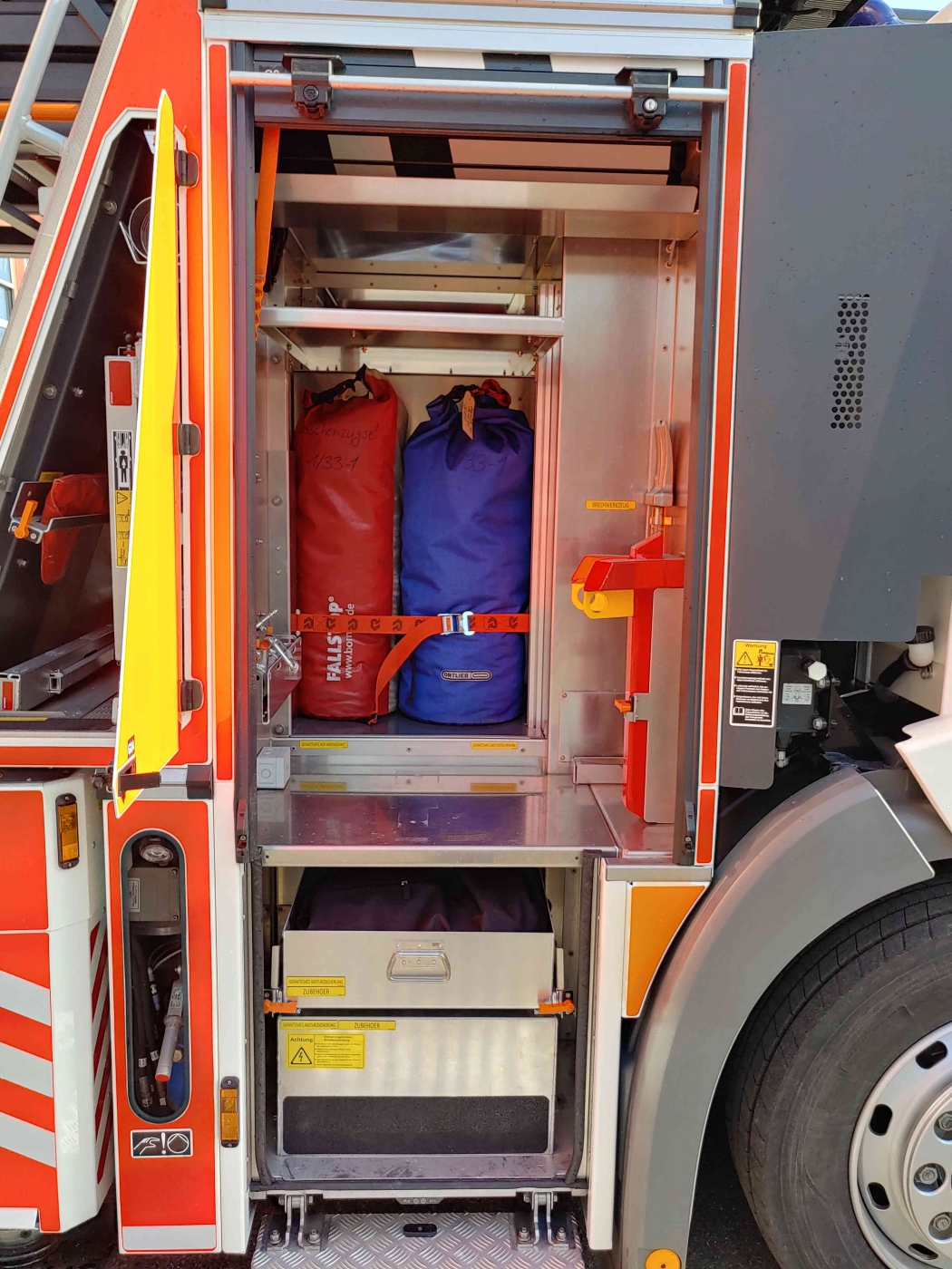 - 2x PA im Führerhaus - Sprungretter - Auf- und Abseilgerät und Gerätesatz Absturzsicherung - 5x Faltbare Pylonen und Absperrband - Schleifkorbtrage und Krankentragenlagerung (mit Adapter auch für Schwerlast- Schleifkorb bis 300kg) - mitgeführtes Schlauchmaterial: 2x B 20m, 1x B 35m, 2x C 15m, 1x C 5m - manueller Monitor - Rauchschutzvorhang - Elektrokettensäge mit Schnittschutzkleidung und Bügelsäge - Spalthammer und Halligan-Tool - Schnellangriff Druckluft |