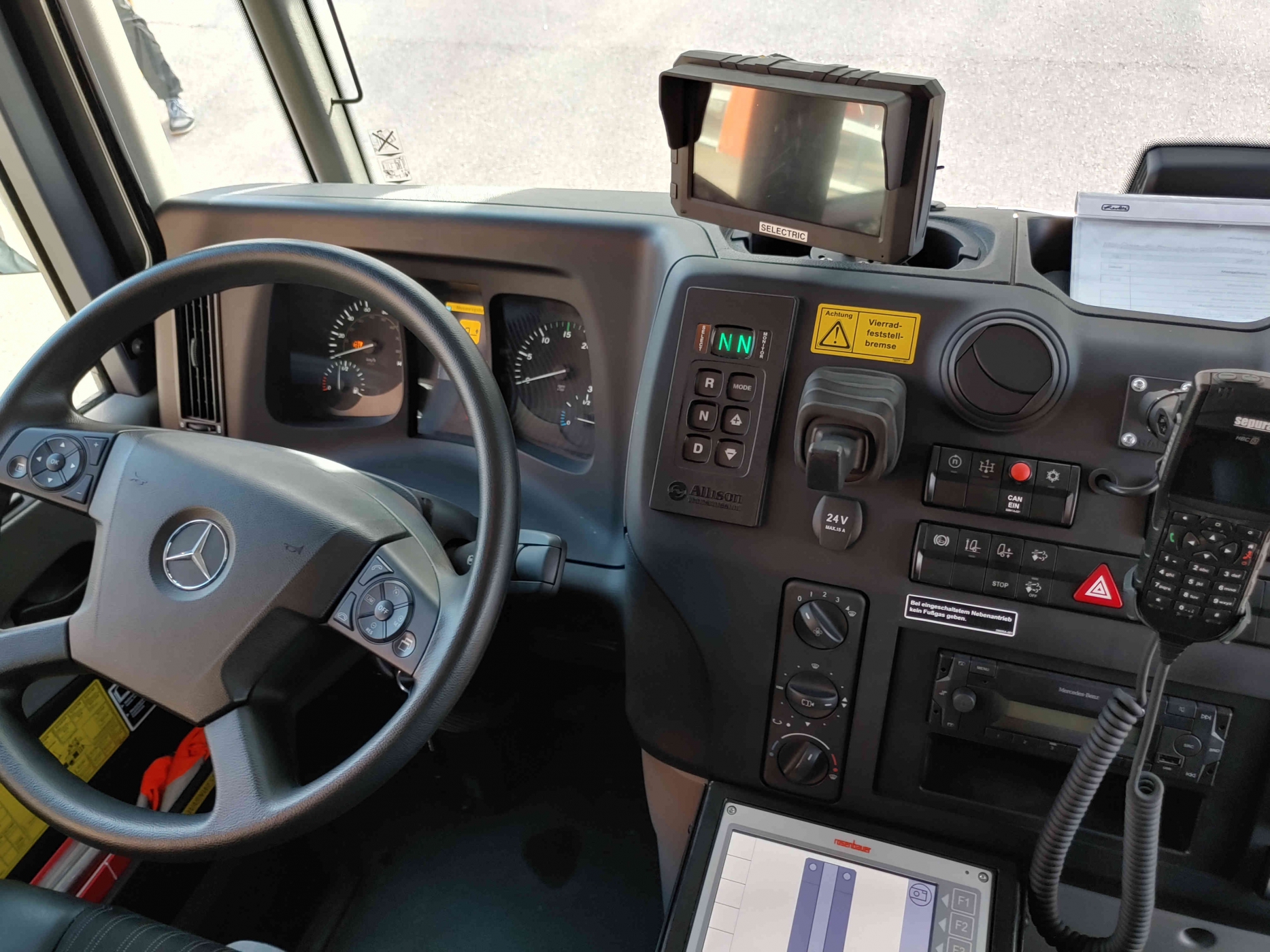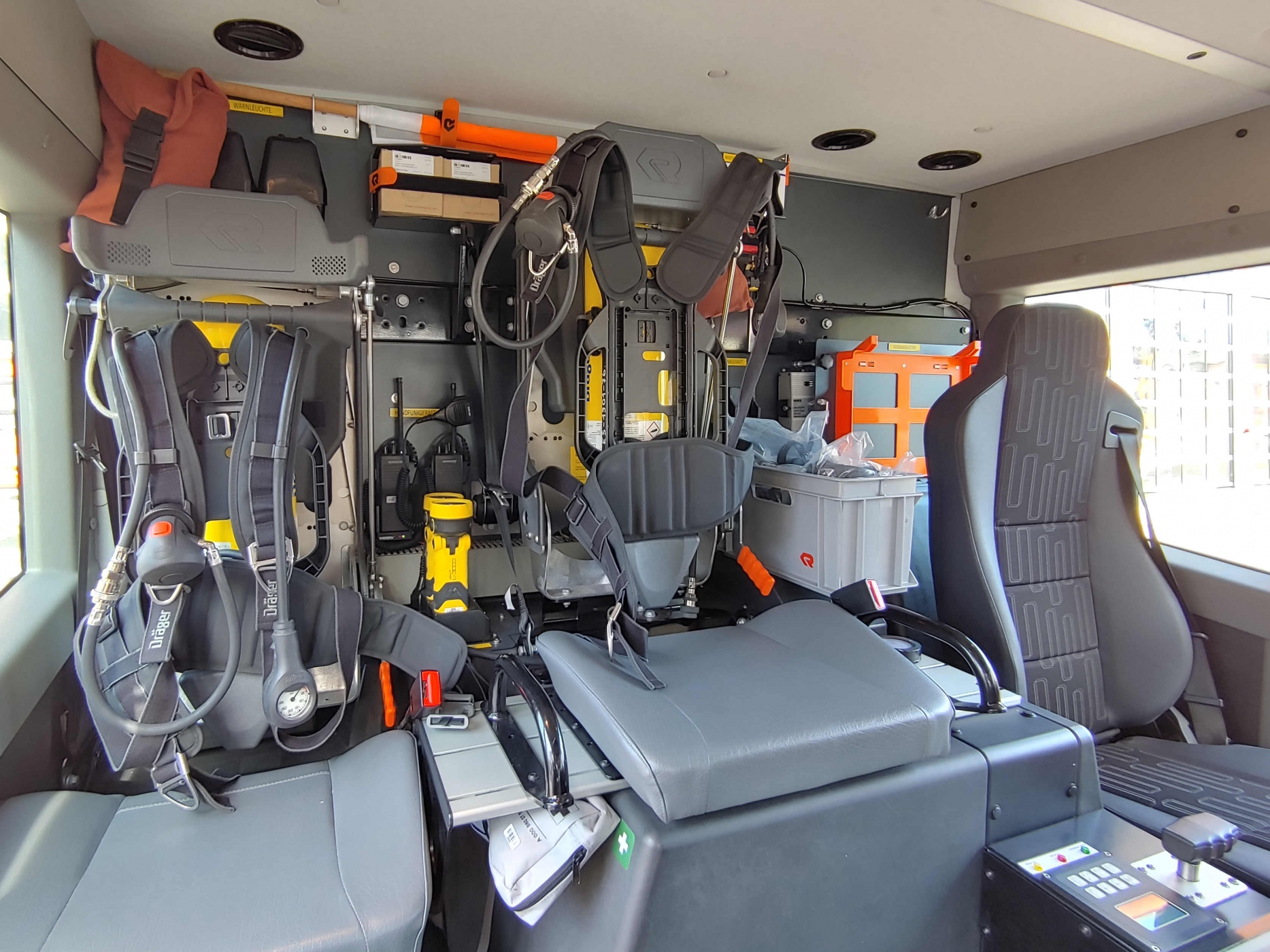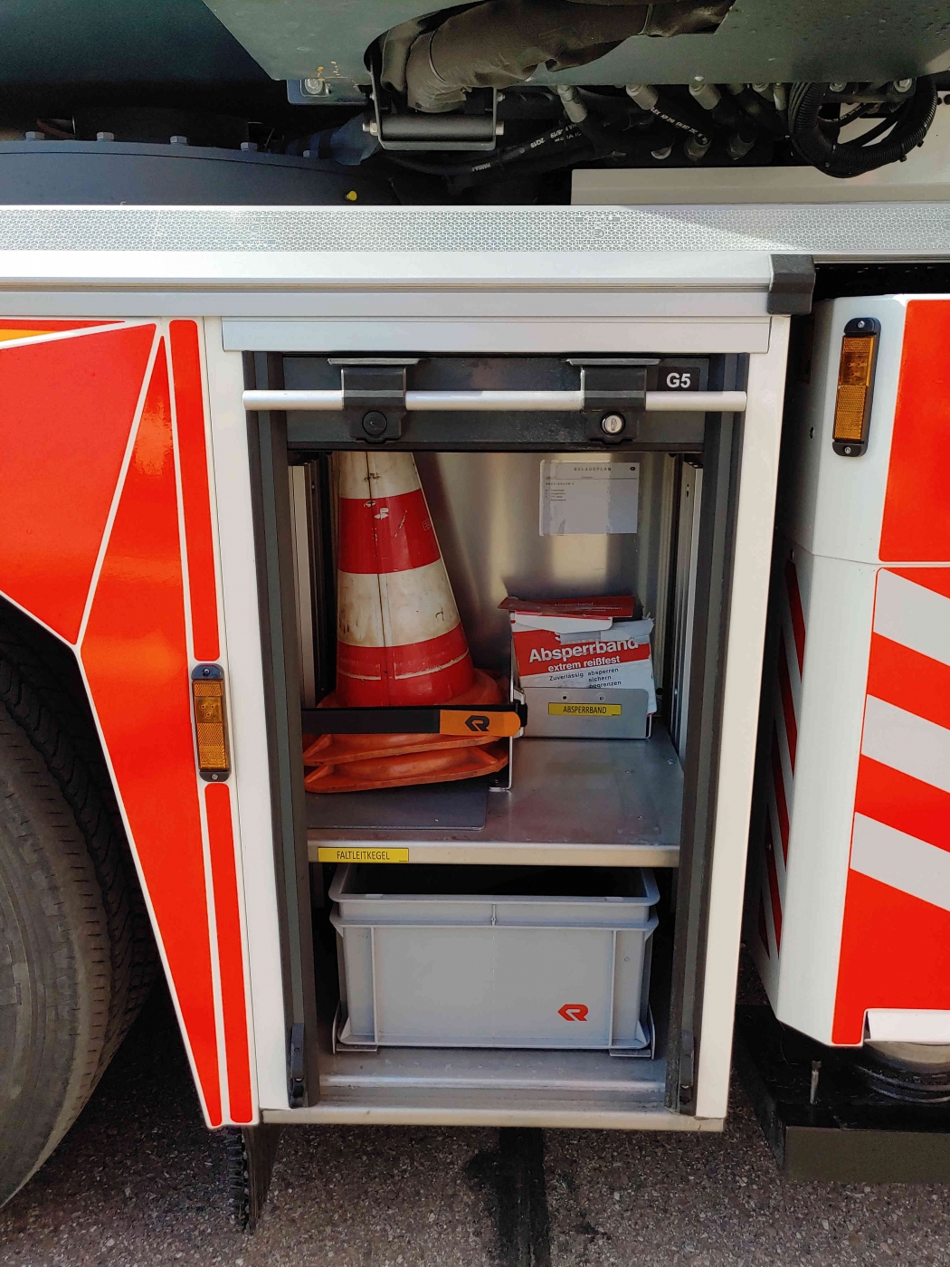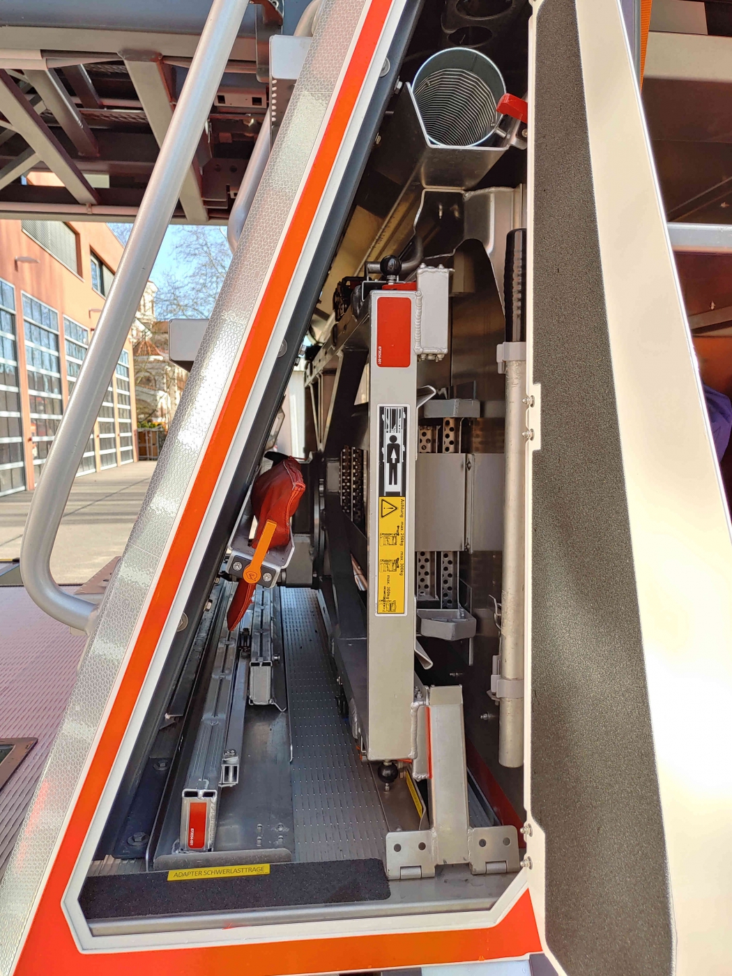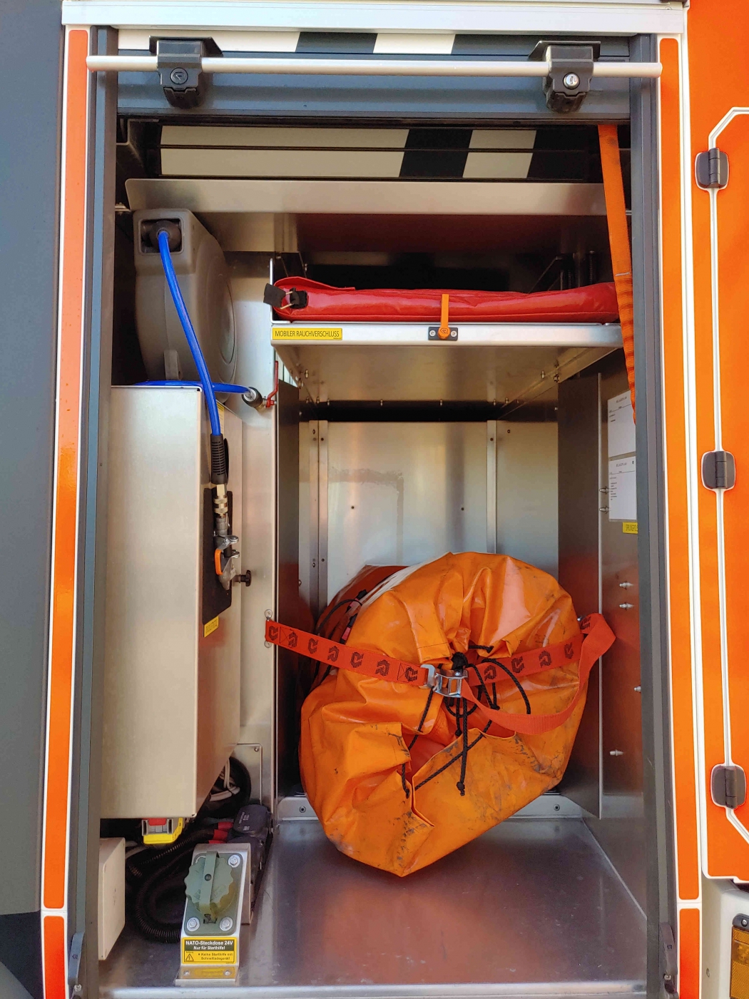 - 2x PA im Führerhaus - Sprungretter - Auf- und Abseilgerät und Gerätesatz Absturzsicherung - 5x Faltbare Pylonen und Absperrband - Schleifkorbtrage und Krankentragenlagerung (mit Adapter auch für Schwerlast- Schleifkorb bis 300kg) - mitgeführtes Schlauchmaterial: 2x B 20m, 1x B 35m, 2x C 15m, 1x C 5m - manueller Monitor - Rauchschutzvorhang - Elektrokettensäge mit Schnittschutzkleidung und Bügelsäge - Spalthammer und Halligan-Tool - Schnellangriff Druckluft |
